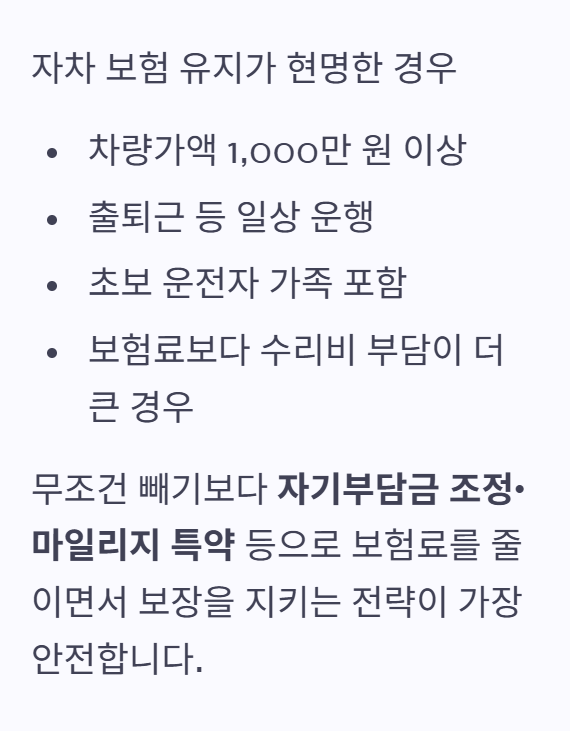 👉 보험료는 줄이되 보장은 유지하는 전략이 안전합니다.