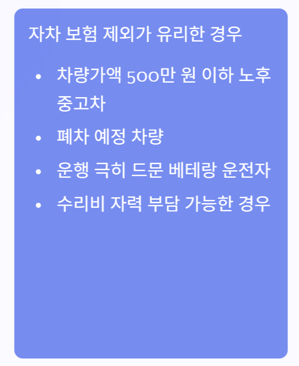 위 조건이 아니라면 자차 보험 제외는 위험합니다.