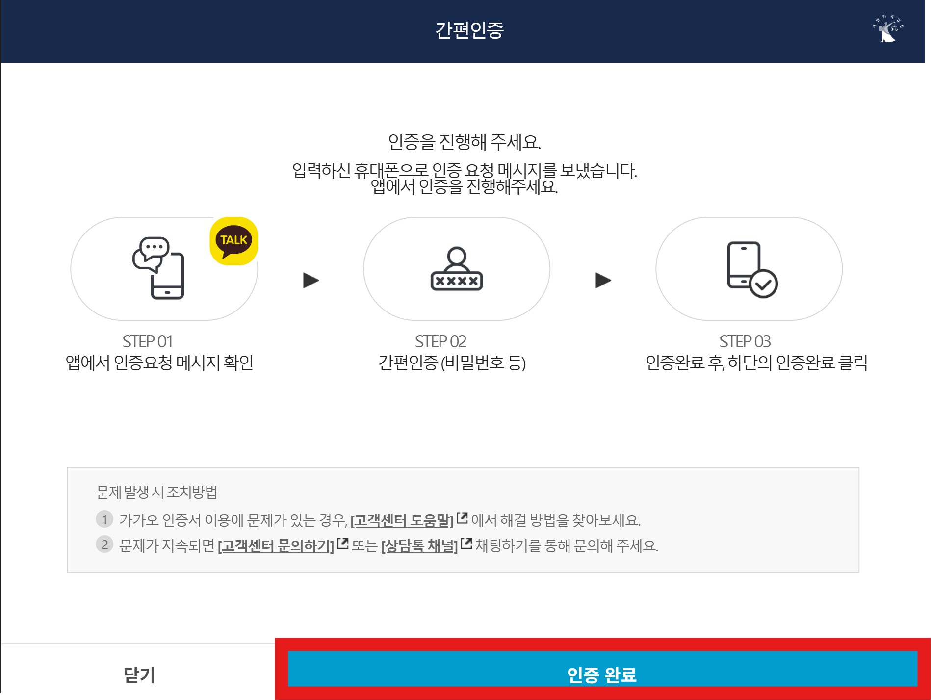 인증이 끝나면 웹 화면에서 ‘인증 완료’ 버튼을 누릅니다.
