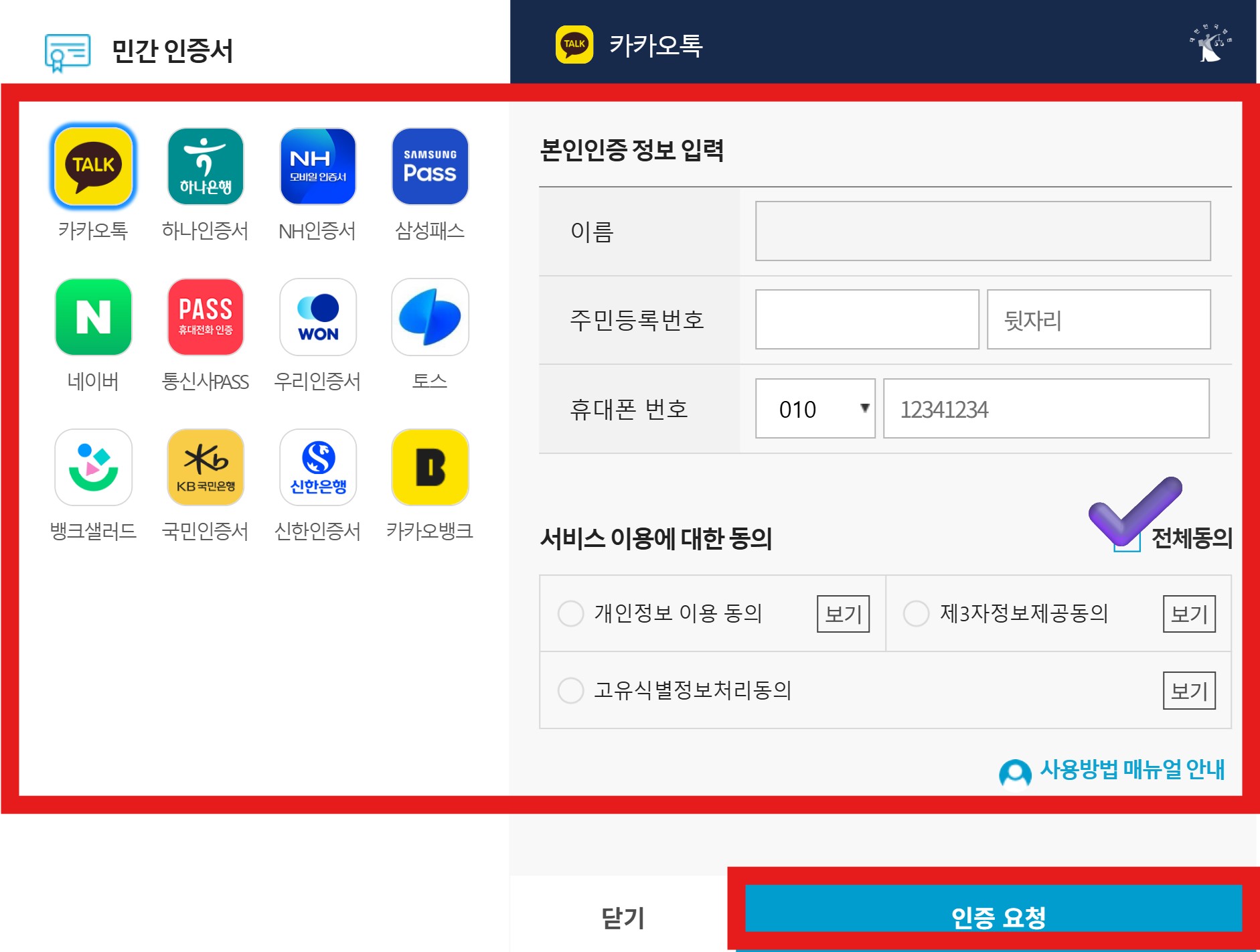저는 간편인증 카카오톡으로 인증을 진행하였으니,