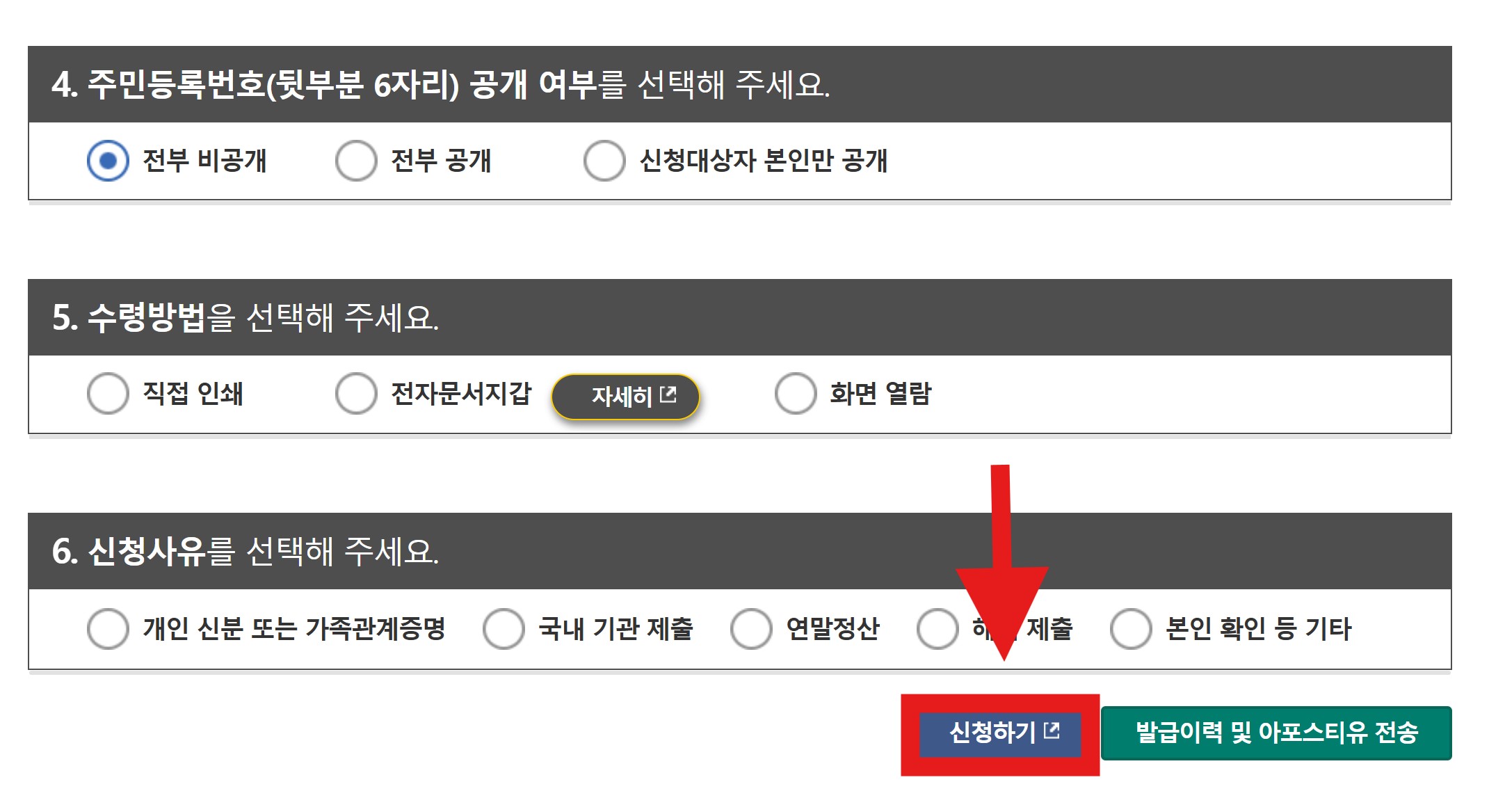 7. 주민번호 공개 여부 선택 및 수령 방식 설정
