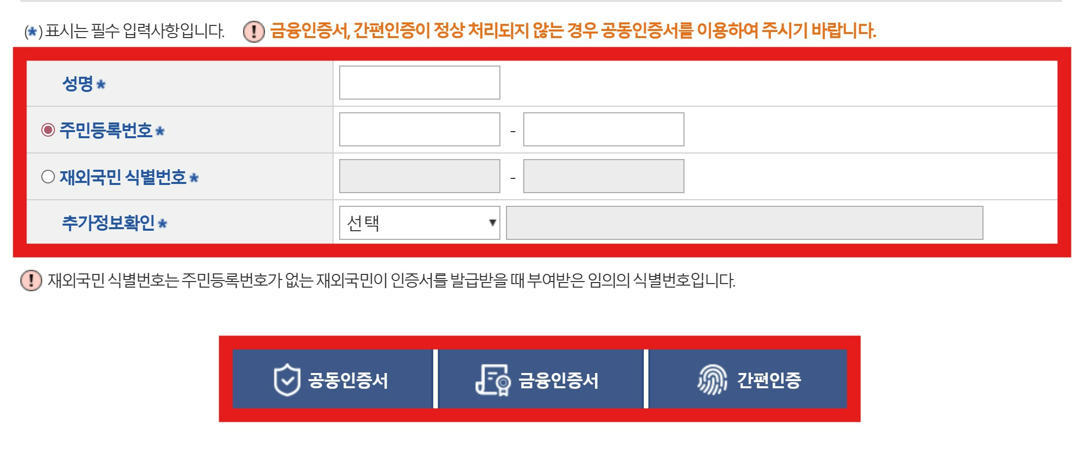 인증 방식은 발급 절차 전체에서 매우 중요한 단계이며, 정확한 인증 없이 다음 화면으로 넘어갈 수 없습니다.