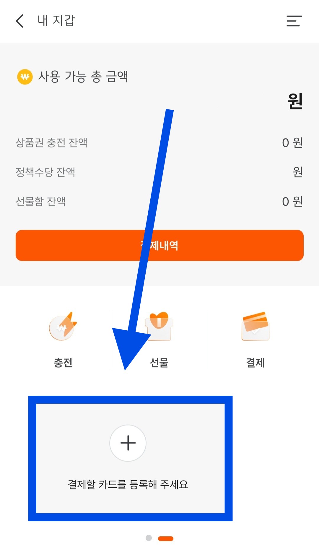 앱 하단에서 *내 지갑]을 누르면 보유 잔액이 나오고, 아래로 내려가면 ‘결제할 카드를 등록해 주세요’라는 안내가 보입니다.