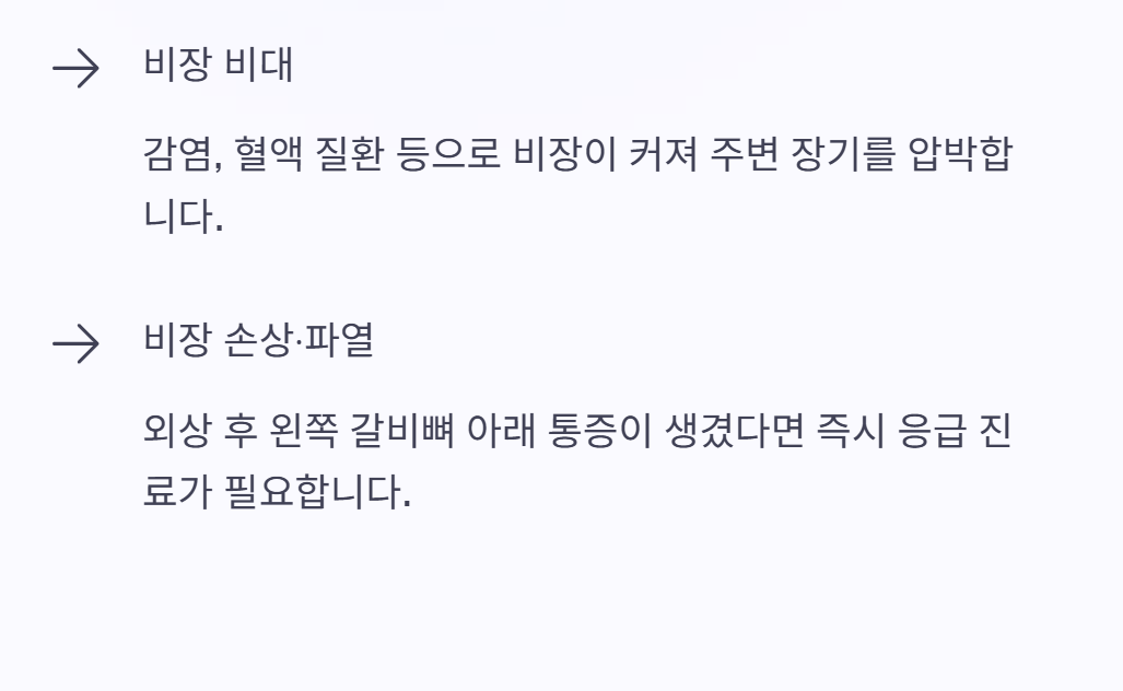 비장이 커지거나 손상되면 왼쪽 갈비뼈 아래 통증이 발생할 수 있습니다.