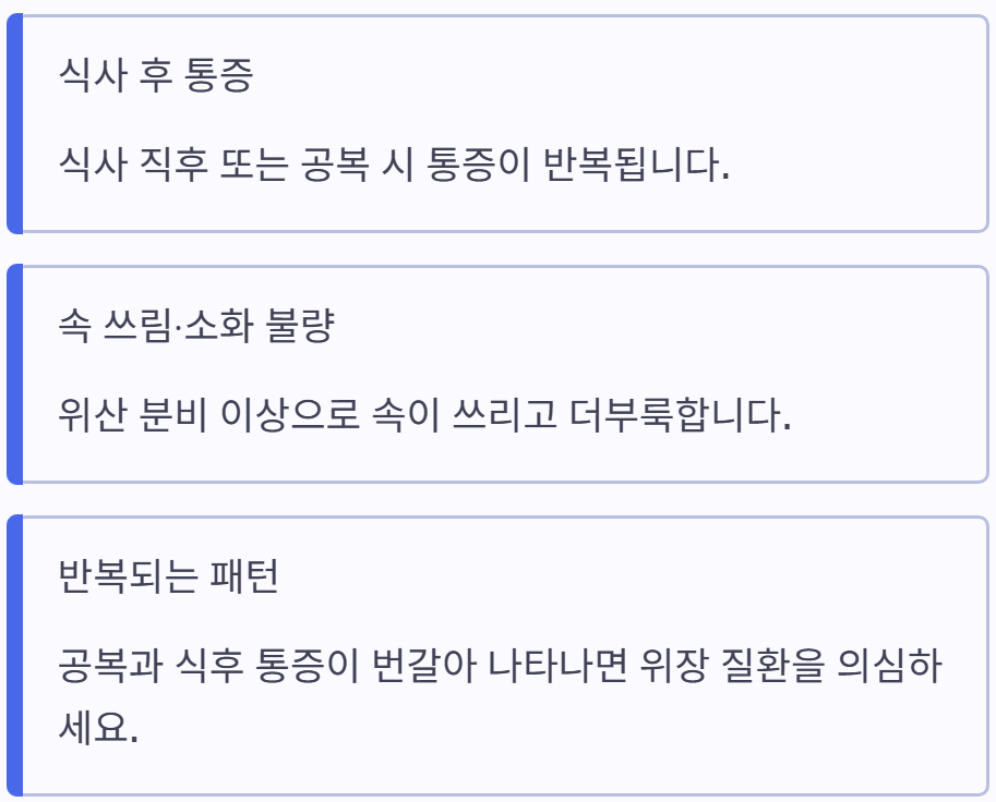 특히 공복이나 식사 후 통증이 반복된다면 위장 질환 가능성을 고려해야 합니다.