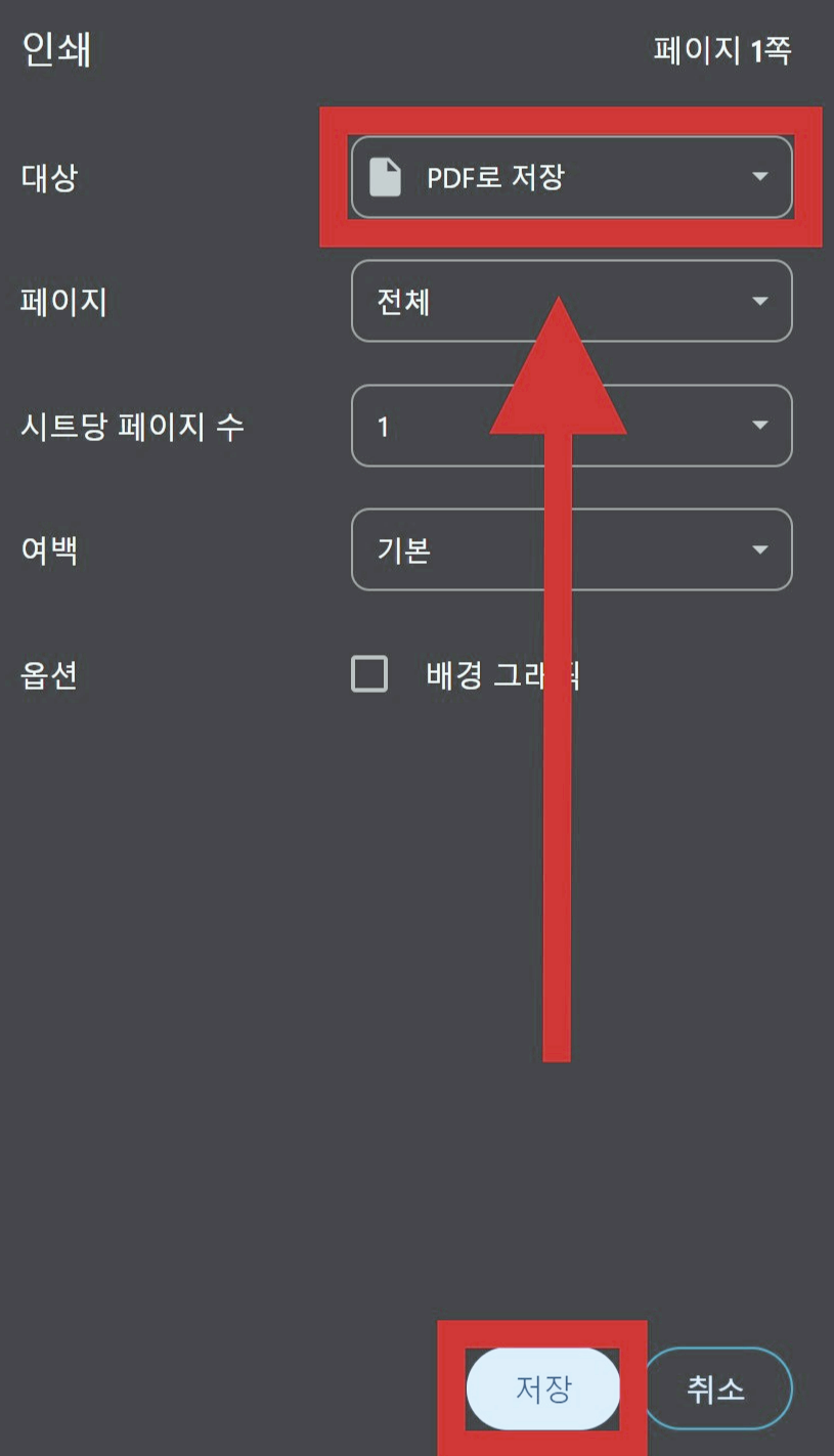 - ‘대상’ 항목에서 ‘PDF로 저장’ 선택