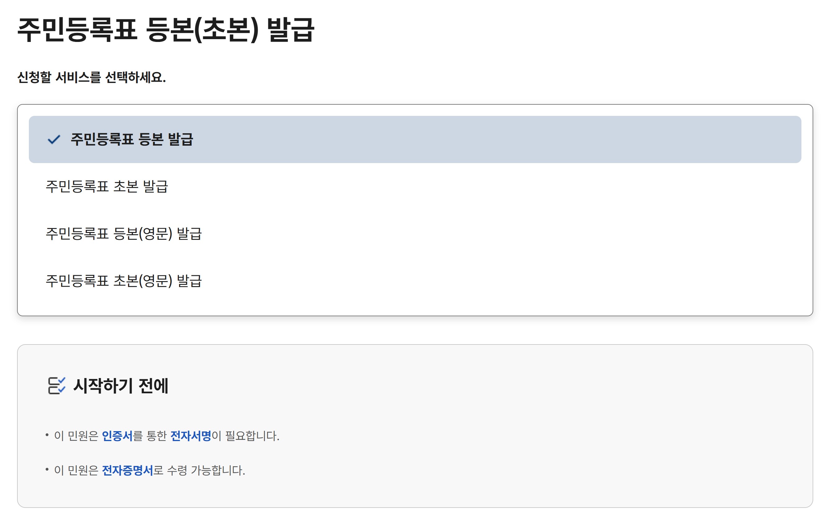 대부분의 기관은 기본 주민등록등본을 요구하므로 첫 번째 항목을 선택하면 됩니다.