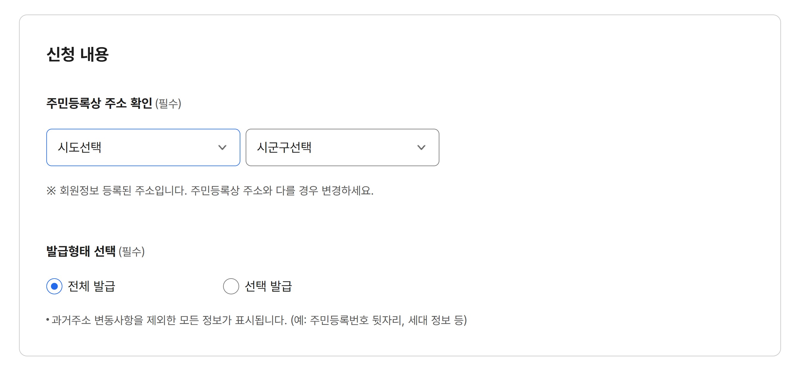 주소 정보 및 발급 항목 설정