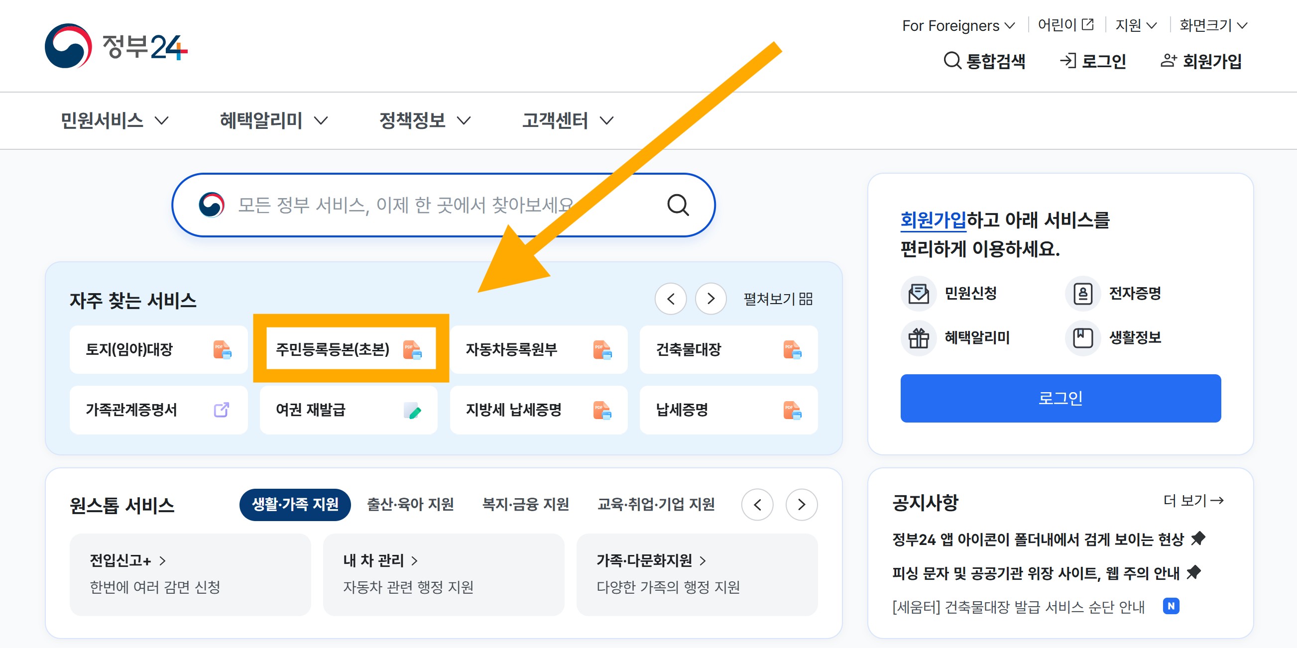 정부24 홈페이지에 접속하면 가장 먼저 보이는 상단 검색창 또는 ‘자주 찾는 서비스’