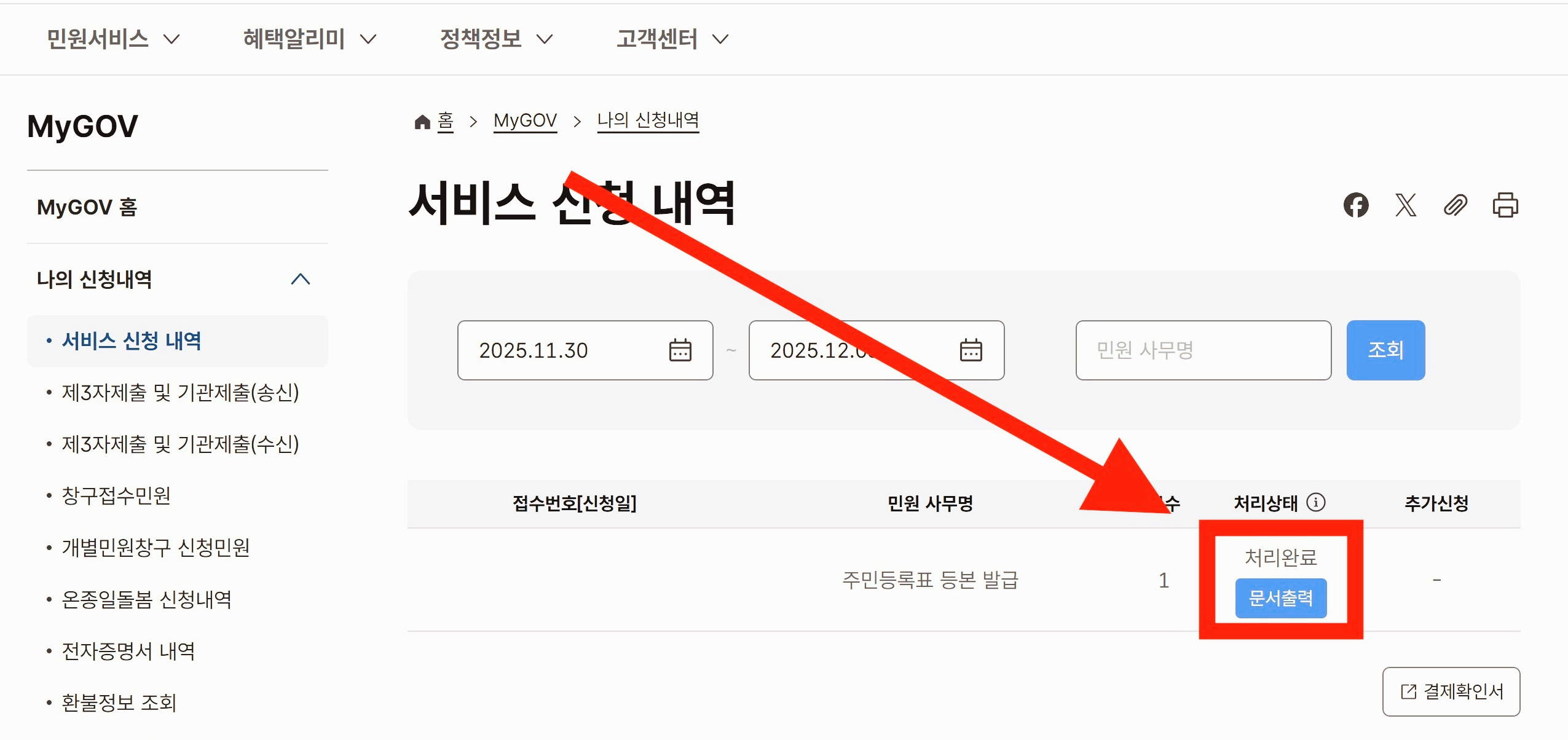 MyGov → 서비스 신청 내역 → 문서출력